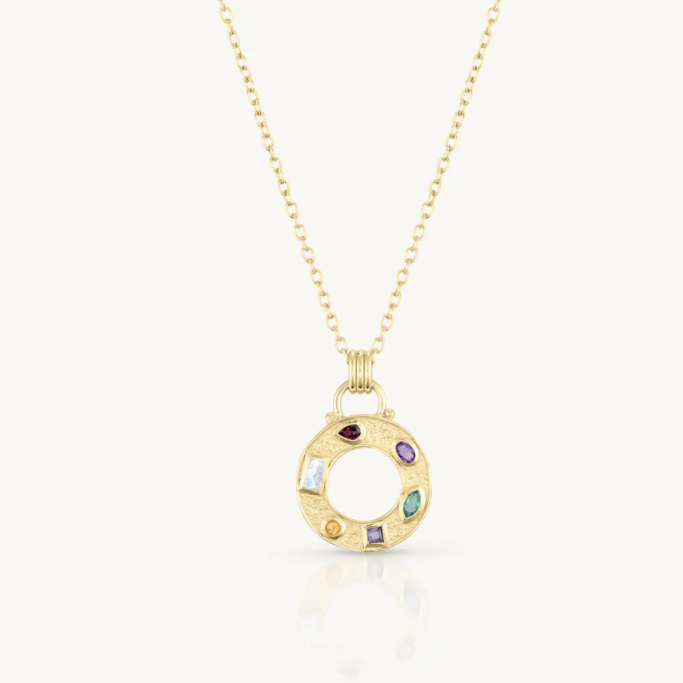 A round amulet with a textured surface, adorned with a ring of bezel-set stones - Rhodolite, Amethyst, Apatite, Iolite, Citrine, and Moonstone, a vibrant spectrum of colours, each placed with intention.