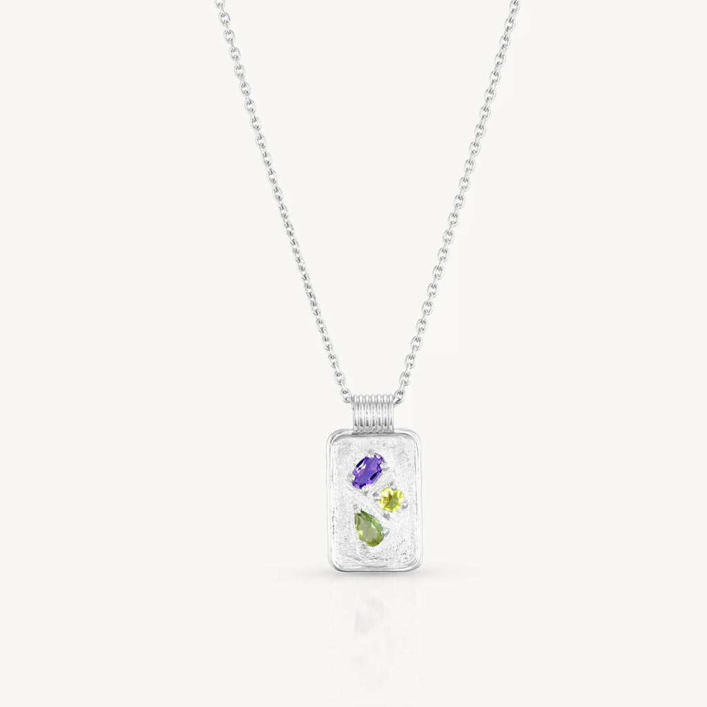 Encased in a sleek baguette-shaped pendant with a textured face, three prong-set stones - a round Peridot, a marquise Apatite, and an oval Amethyst - whisper ancient secrets.