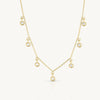 Seven delicate pendants glimmer with round Cubic Zirconia stones at their centre, each framed by fine etched linework that radiates softly outward.