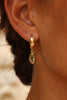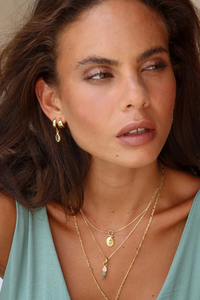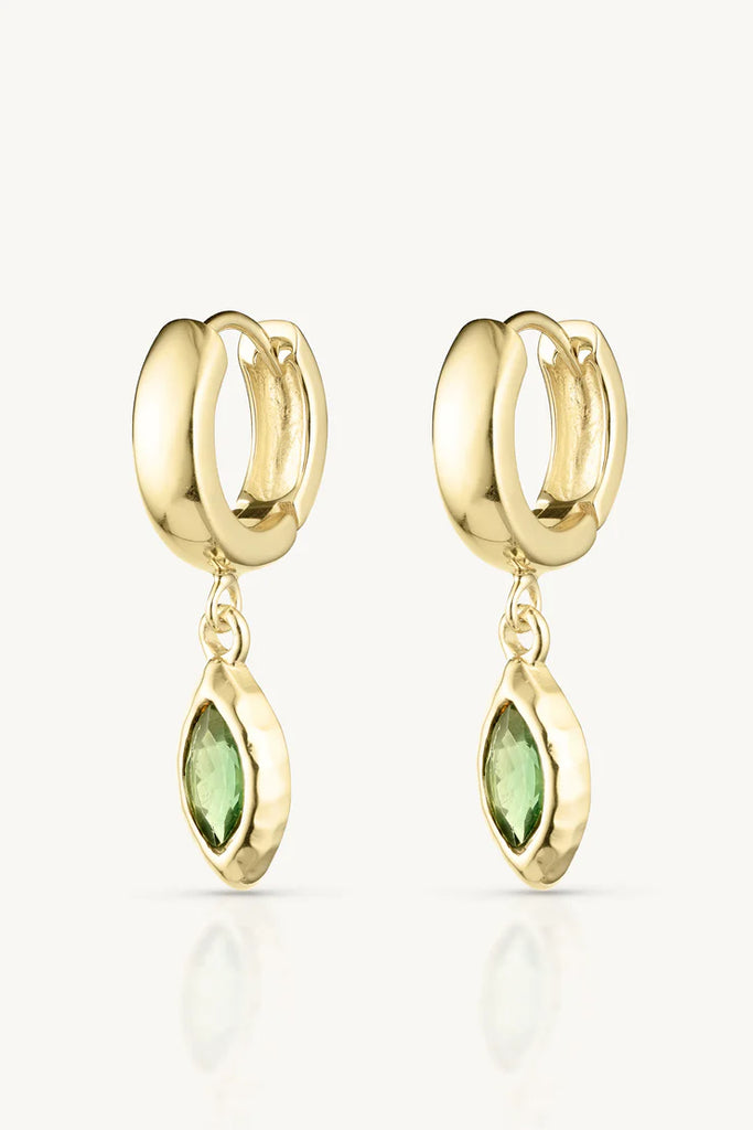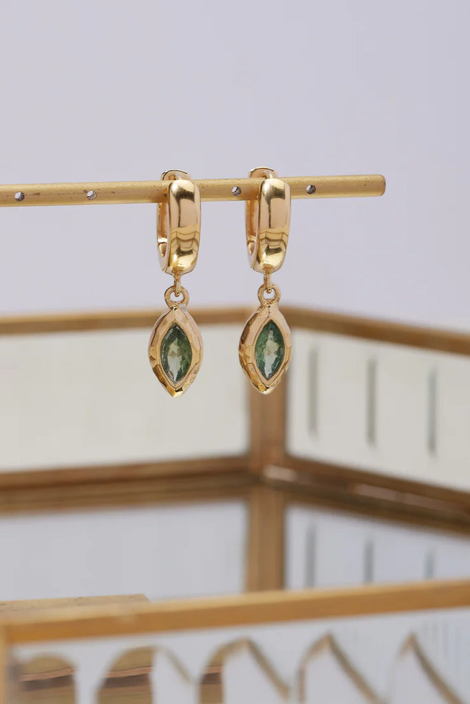 The Belle Huggies are a stunning single marquise stone drop set available in Apatite. The hand cut stones are bezel set with a delicately hammered finish.