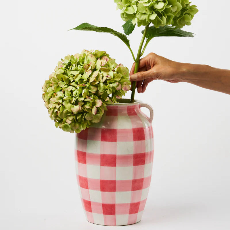 Our Fresco Check Vase reimagines classic gingham through artisanal ceramic techniques, each pink-and-white square hand-painted with gentle variation. Crafted by our partners in Santo Tomas, Philippines, this wheel-thrown vessel creates unexpected harmony between traditional pattern and contemporary form. With its generous proportions and dual handles, this statement piece brings both nostalgia and freshness to bookcase styling or dining table.