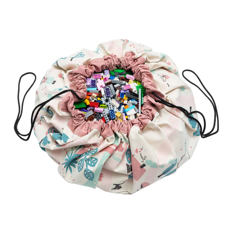 Take your playroom with you: Turn the bag into a flat playmat which makes all toys easily accessible, no matter where you are. And when it’s time to go, pull the string and your toys will be tucked inside. Ready for the next adventure.