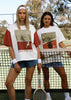 Crisp white box‑cut tee framed in a vintage court colour scheme from Far Mer. Contrast court green ribbing at the neck and clay red sleeves set the tone, while Whitney Spicer’s Vintage Serve artwork sits proudly across the chest. Finished with Cowboy Tennis Club branding, this silhouette carries the spirit of heritage tennis into a modern collectible.