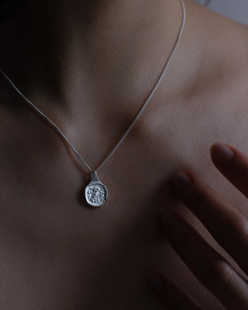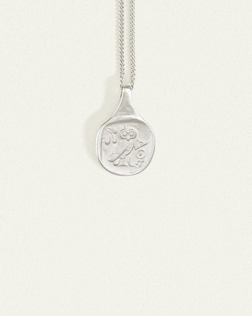 Elevate your style with the Palas Coin Necklace in Silver. Inspired by the Athenian tetradrachm, the small coin pendant showcases an embossed owl, symbolizing wisdom. Suspended from a fine curb chain, this necklace is a sophisticated addition to any outfit.