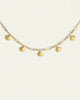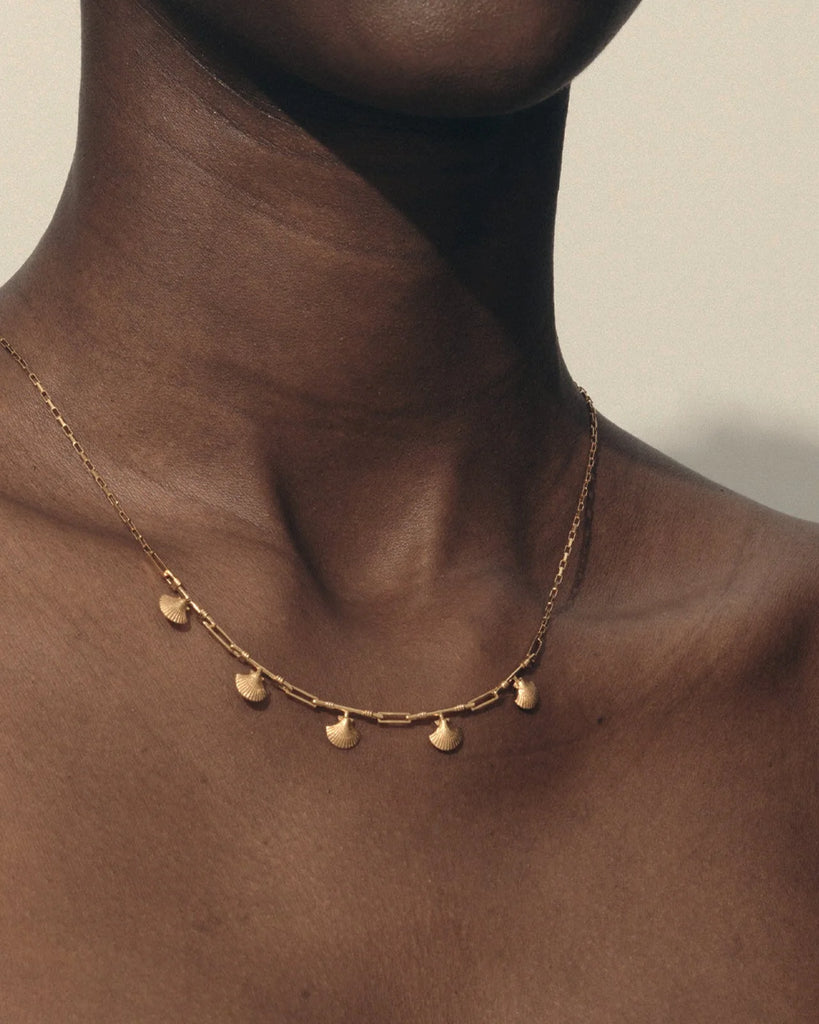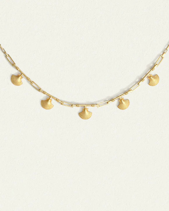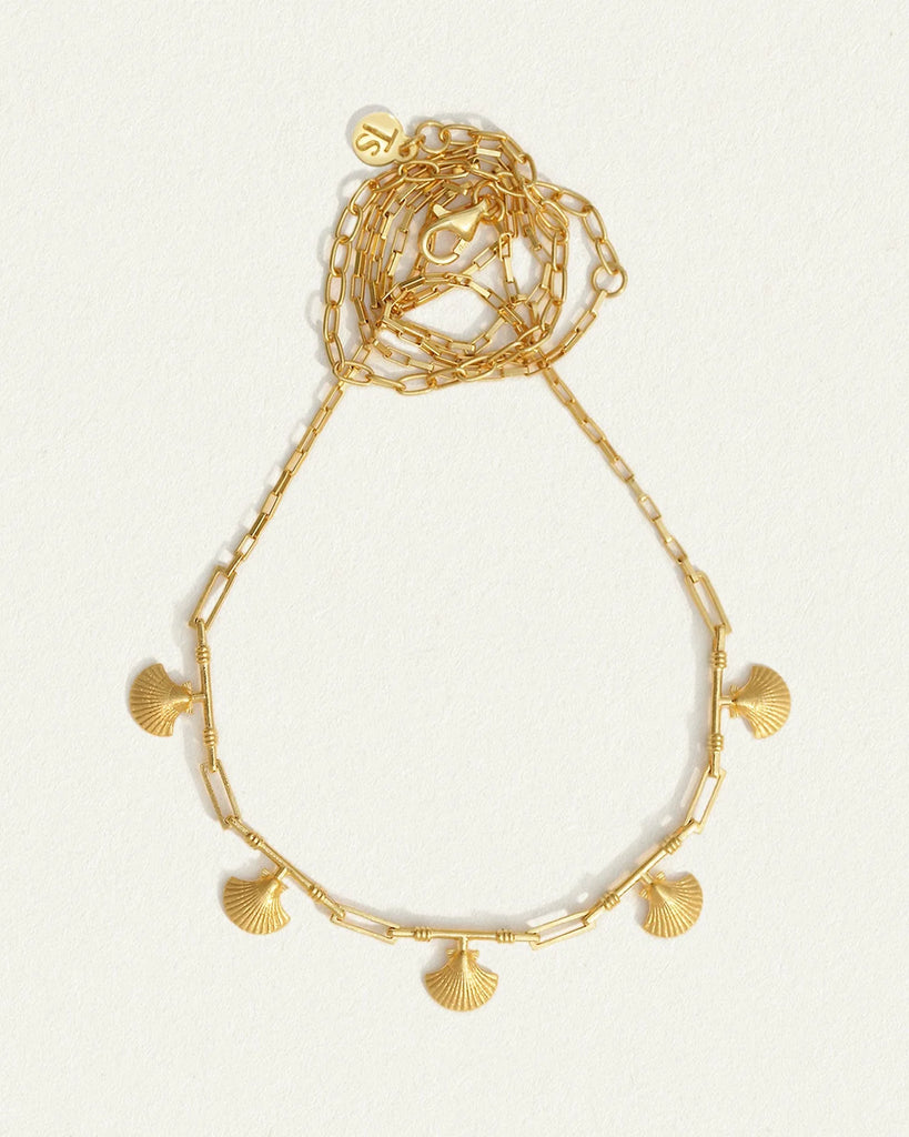 Indulge in the allure of the Temple of the Sun Eleni Necklace, crafted in captivating gold vermeil. Inspired by Aphrodite, the goddess of love, its lustrous shell pendants dangle delicately from a shimmering long box chain. Illuminate any occasion with the radiance of the sun or a woman in love.