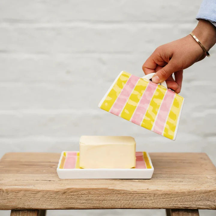 The Large Butter Dish by Noss & Co comfortably fits a 250-gram slab of butter. Adorned with vibrant pink and yellow stripes, each hand-painted dish is one of a kind, boasting lovely little quirks that make it special. Eye-catching enough to keep on your table, this dish is far too delightful to tuck away and will add a splash of fun to your morning routine.
