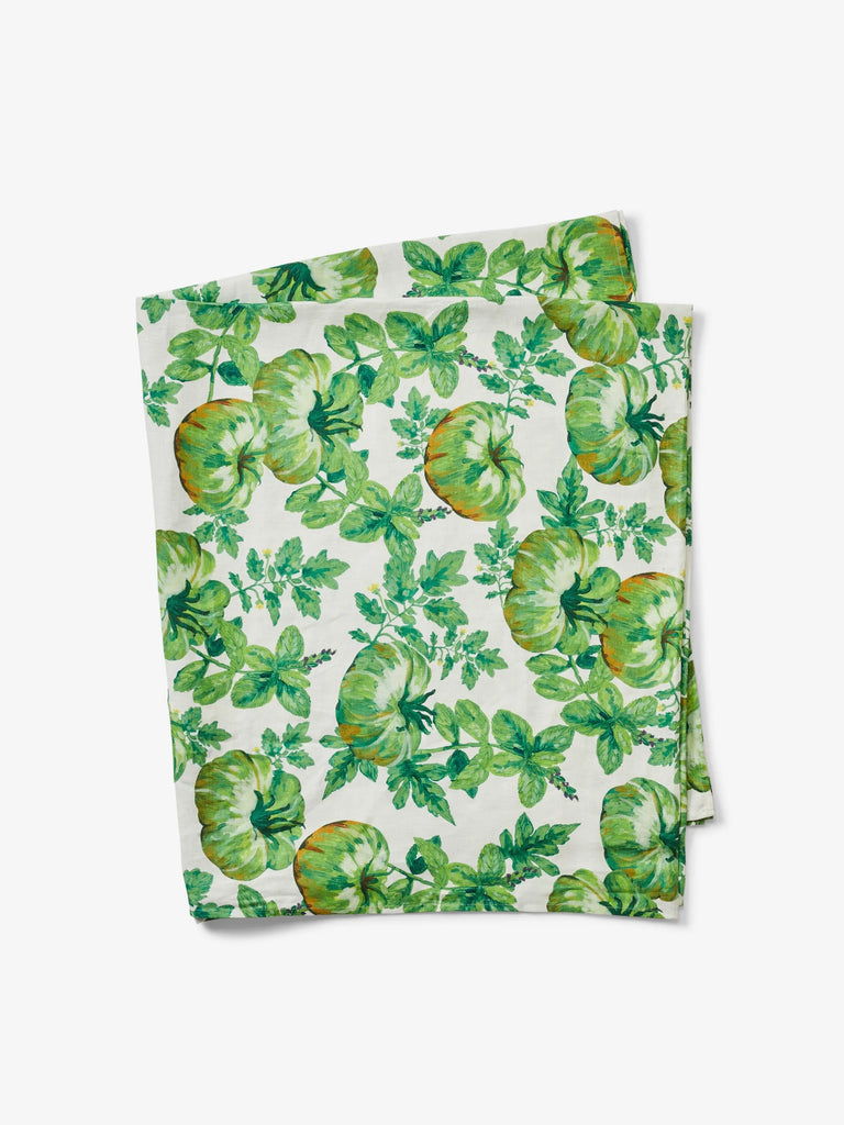 Hand-drawn heirloom tomatoes, leafy herbs, and climbing vines scatter across this green linen tablecloth by Bonnie & Neil, perfect for long lunches, seasonal gatherings, or family dinners.