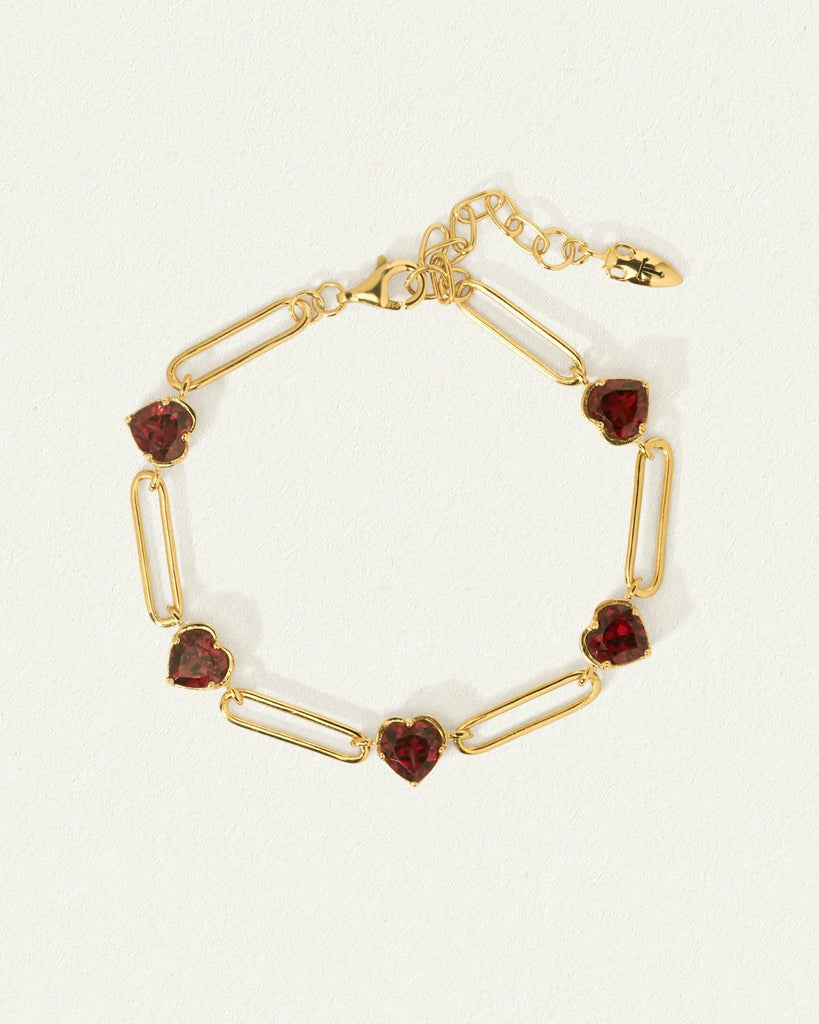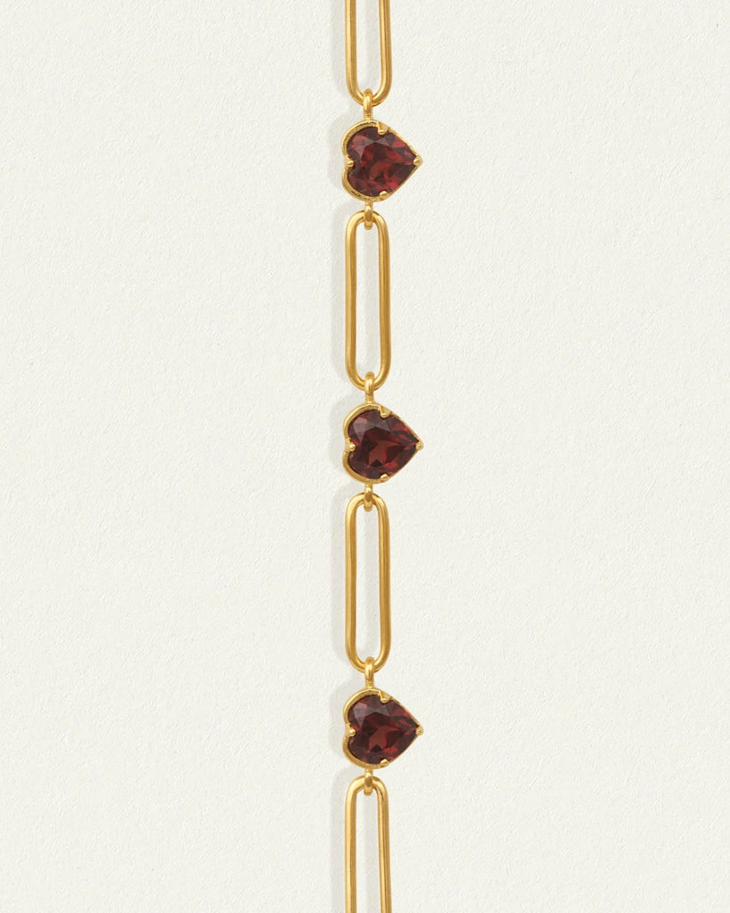 Indulge in romance with the Venus Chain Bracelet. Luscious garnet hearts, known for their symbolism of love and loyalty, are connected by elegant, elongated gold links. Made of 18k gold vermeil, this exquisite bracelet will enhance any outfit with its luxurious paperclip chain design.