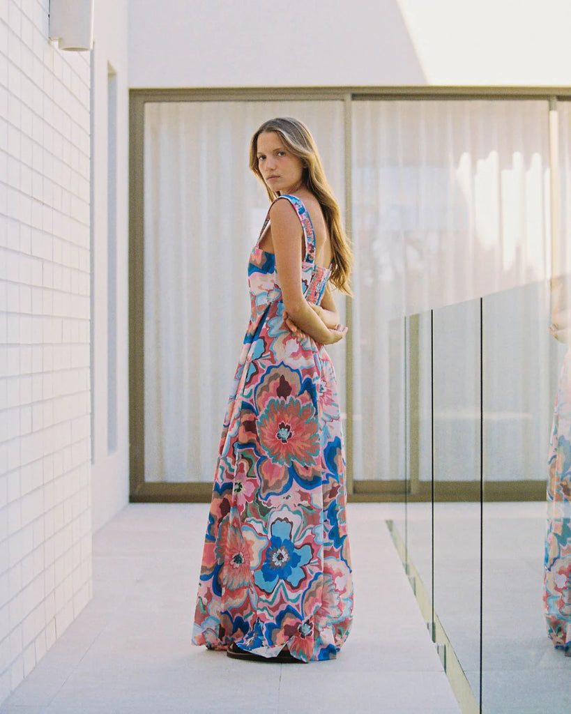 Flow into the season with the Roma Dress from Walnut Melbourne. This full-length style features a softly structured bodice, wide ruched straps, and a smocked back for ease and comfort. Cut in airy cotton voile, it’s the perfect maxi for long lunches or garden weddings.
