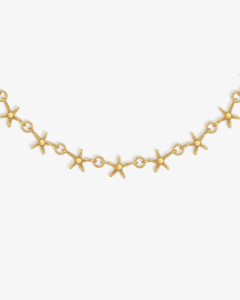 The Seba Chain is an 18k gold vermeil necklace featuring articulated star motifs that move fluidly while catching the light from every angle.