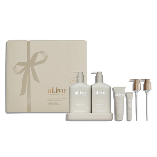 Al.ive Body Icon Set - Sea Cotton & Coconut + Hand Cream + Lip Gloss + Extra Set of Gold Pumps $125.00