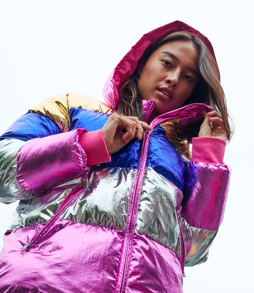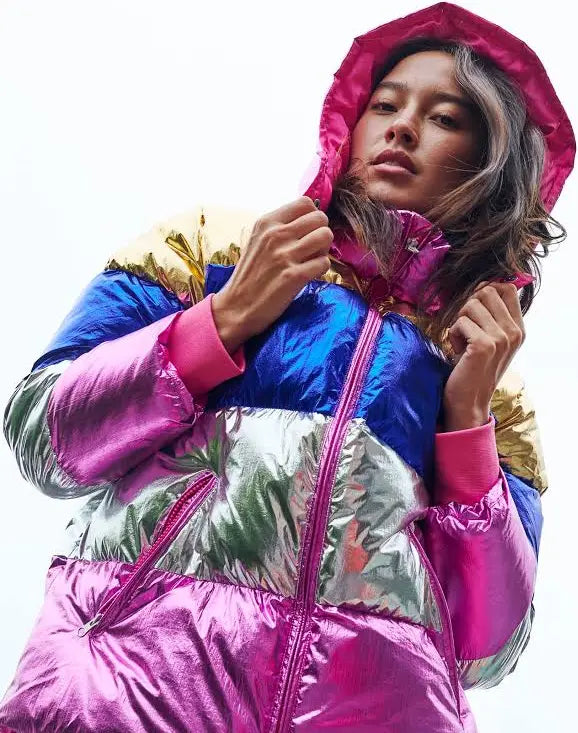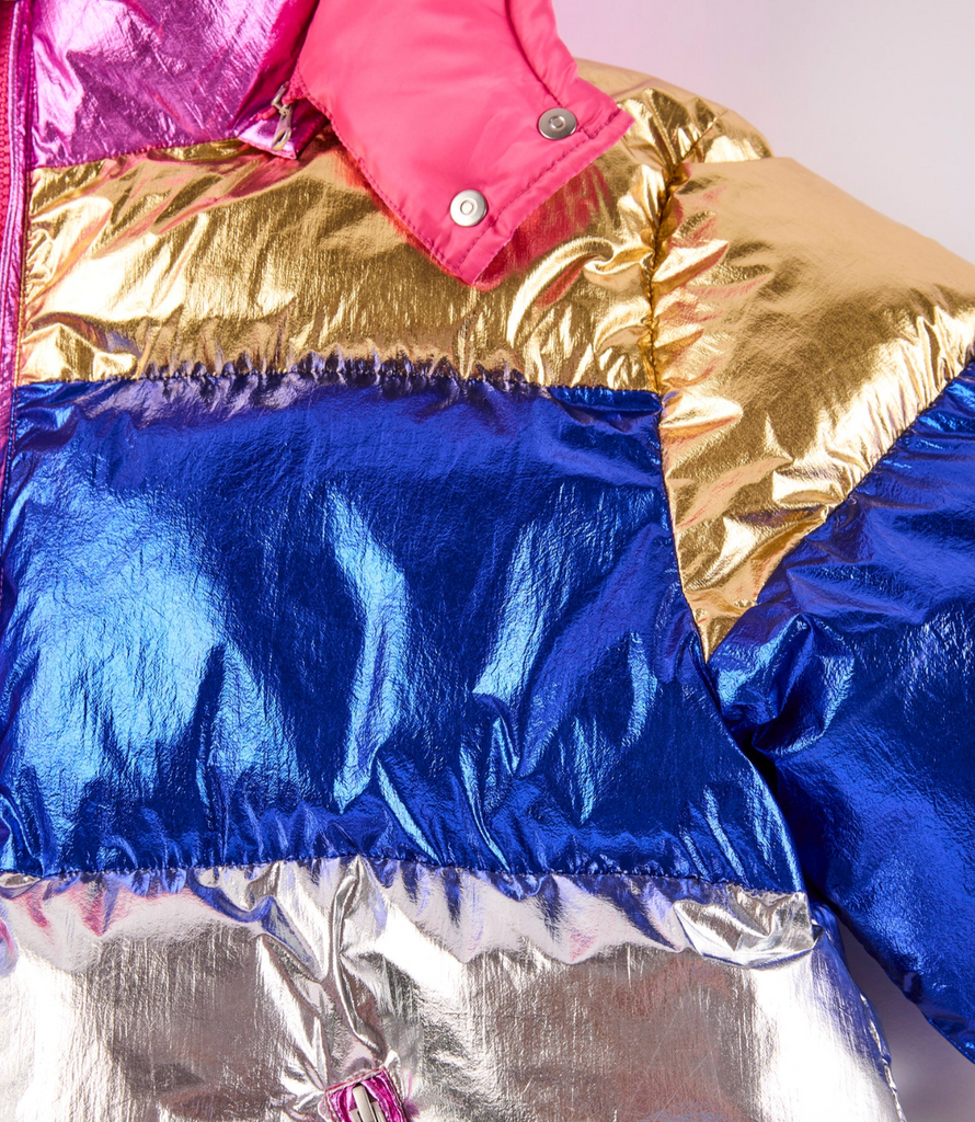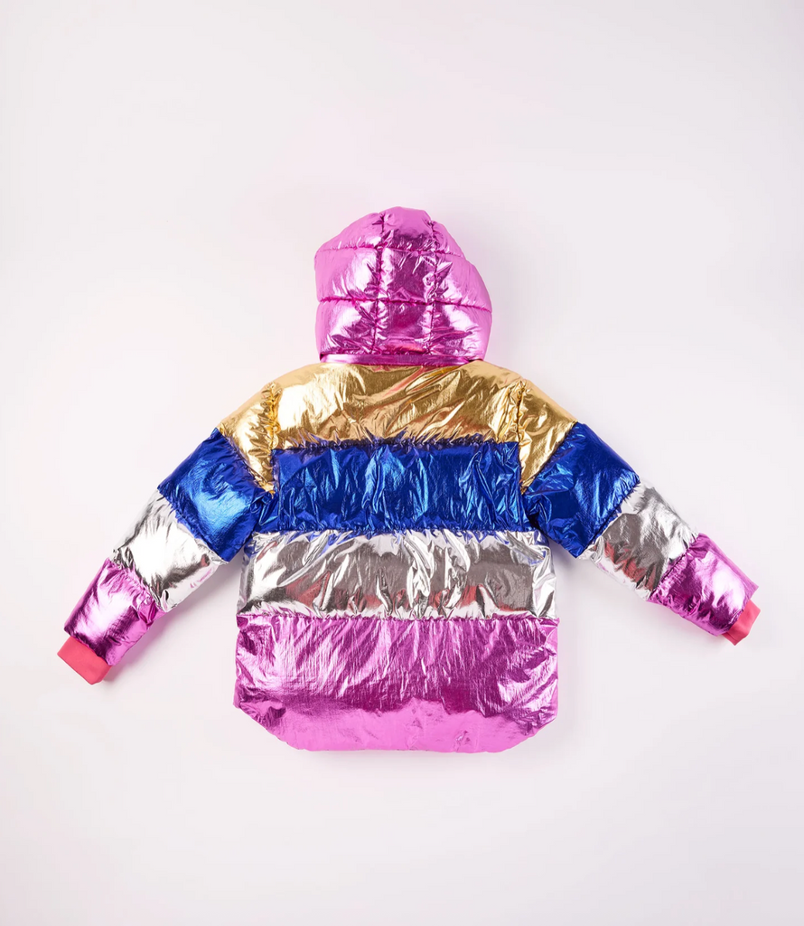 The Dream Weaver Adult Puffa Jacket is a shimmering showstopper! This ultra-cosy, cloud-like zip-up puffa features dazzling layers of pink, gold, royal blue, and silver metallic magic. Complete with a snug hood and handy zip pockets, it's built for strutting, stargazing, and stealing the spotlight. And for the ultimate twinning moment? There's a mini-me version for the little dreamers, too!