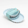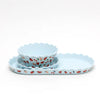 - Fun, fruit-themed silicone kids dinnerware set in a soft blue with a fruity fun print