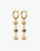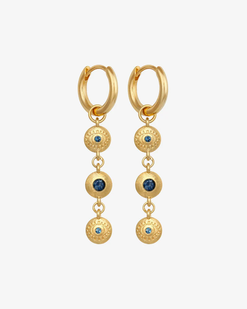 The Blessing Earrings feature a series of cross-brushed, lentil-shaped discs suspended from polished huggie hoops. The mati—or evil eye—motif is carved into the top and bottom discs, a subtle symbol of protection.