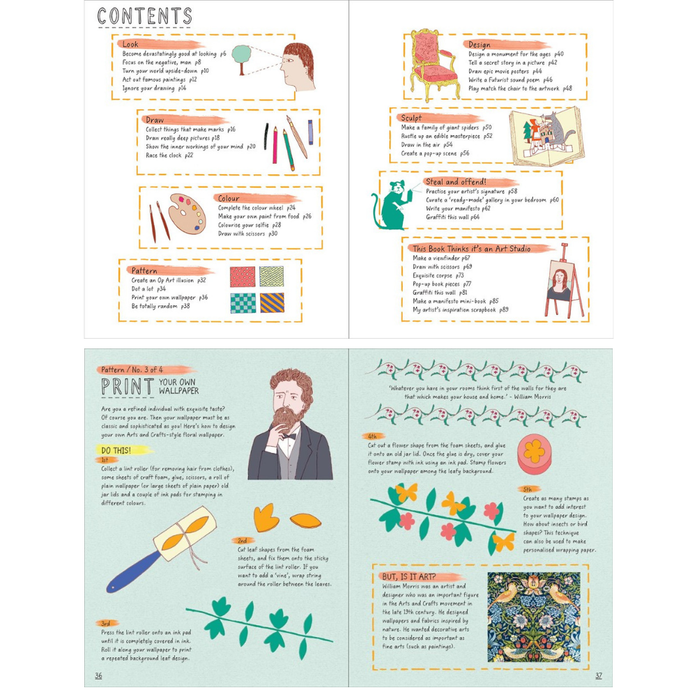 This Book Thinks You're an Artist is one of the rare books on the market to combine art history with practical activities on the page. It asks the reader to imagine their eccentric-artist alter-ego before working through six key topics: painting, sculpture, illustration, decorative art, photography and contemporary art. Each spread centres on a different technique for producing a piece of art, and relates the activity back to a famous artist or movement in a light-hearted and playful tone. Activities include making a Bruegel circus, playing a Surrealist game, selling a scribble for a million pounds and painting your face like a Russian Futurist. A section of paper-based crafts at the end of the book includes a kit to build a camera obscura.